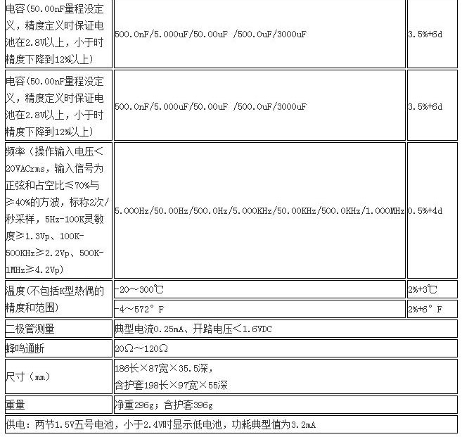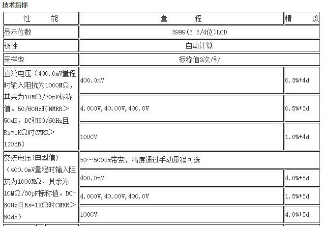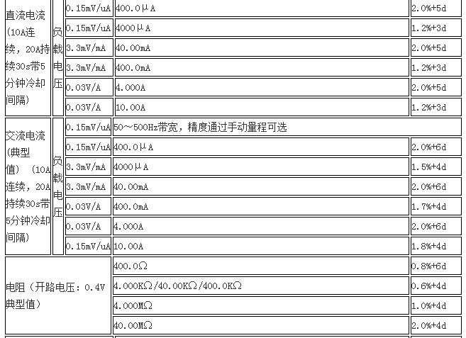 在3V/m的RF場內符合EMC61326(1997,1998/A1),EN61000-4-2(1995),EN61000-4-3(1996):4.000V交流量程時總精度=給定精度+700位;400.0uA交流量程時總精度=給定精度+300位;其它功能量程時總精度=給定精度+40位;電容沒有定義;超過3V/m的RF場沒有定義。