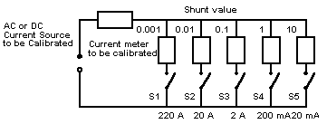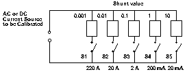 A:由于精密電流分流器能提供比電流源良好的電流穩(wěn)定度及精確度,因此可用來校正直流或交流電流源。下圖顯示出待測電流源與精密電流分流器之間的連接方式,每個電阻器用來分別校驗20mA到220A電流范圍,如此可以得到最佳的精確度。