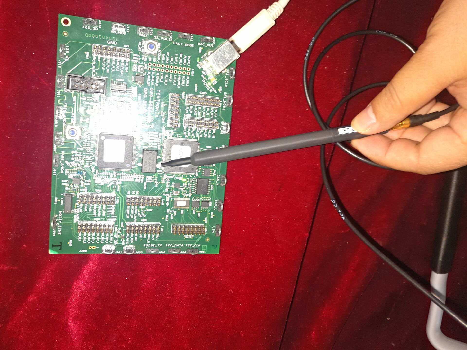 第一步:大多數PCB板都沒有預留射頻接口可以直接接到頻率信號接收機中,本測試中采用無源電場探頭和無源磁場探頭來感應高頻信號場強,通過無源電場探頭和磁場探頭探測需要測量的芯片腳,再把頻率信號接收機設置為全景掃面,找到要測量的點,如下圖所示。
