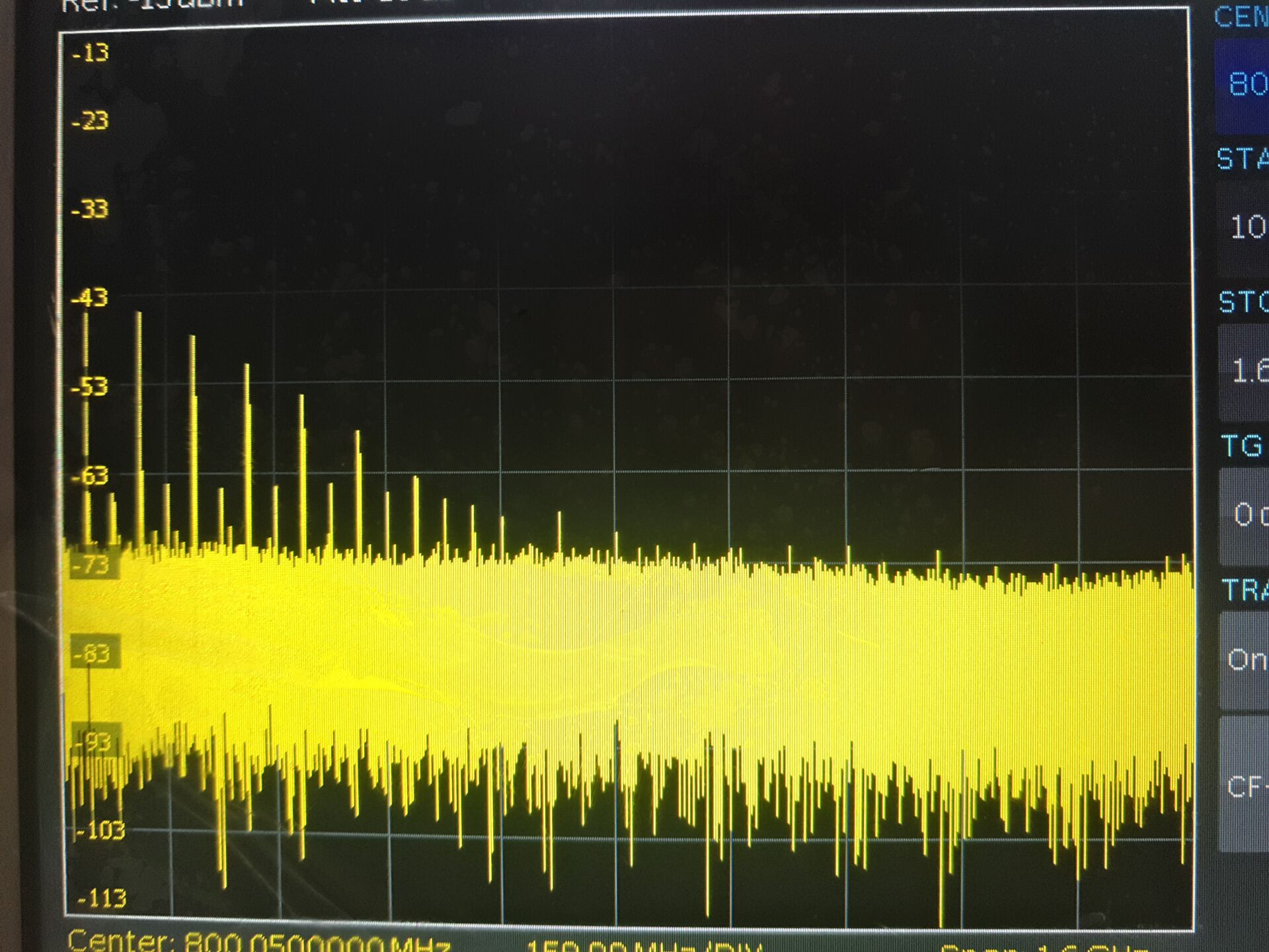 第二步:用無源電場、磁場探頭對電路測量點進行掃描測量,通過頻譜掃描測試掃頻在此頻段(3GHz)范圍內和頻譜特點判斷是否是要測量的信號,通過下圖可以看出被測量信號在頻率信號接收機中的頻譜,找到要進行測量信號對應的頻點(使用頻率信號接收機的峰值游標搜索功能)。