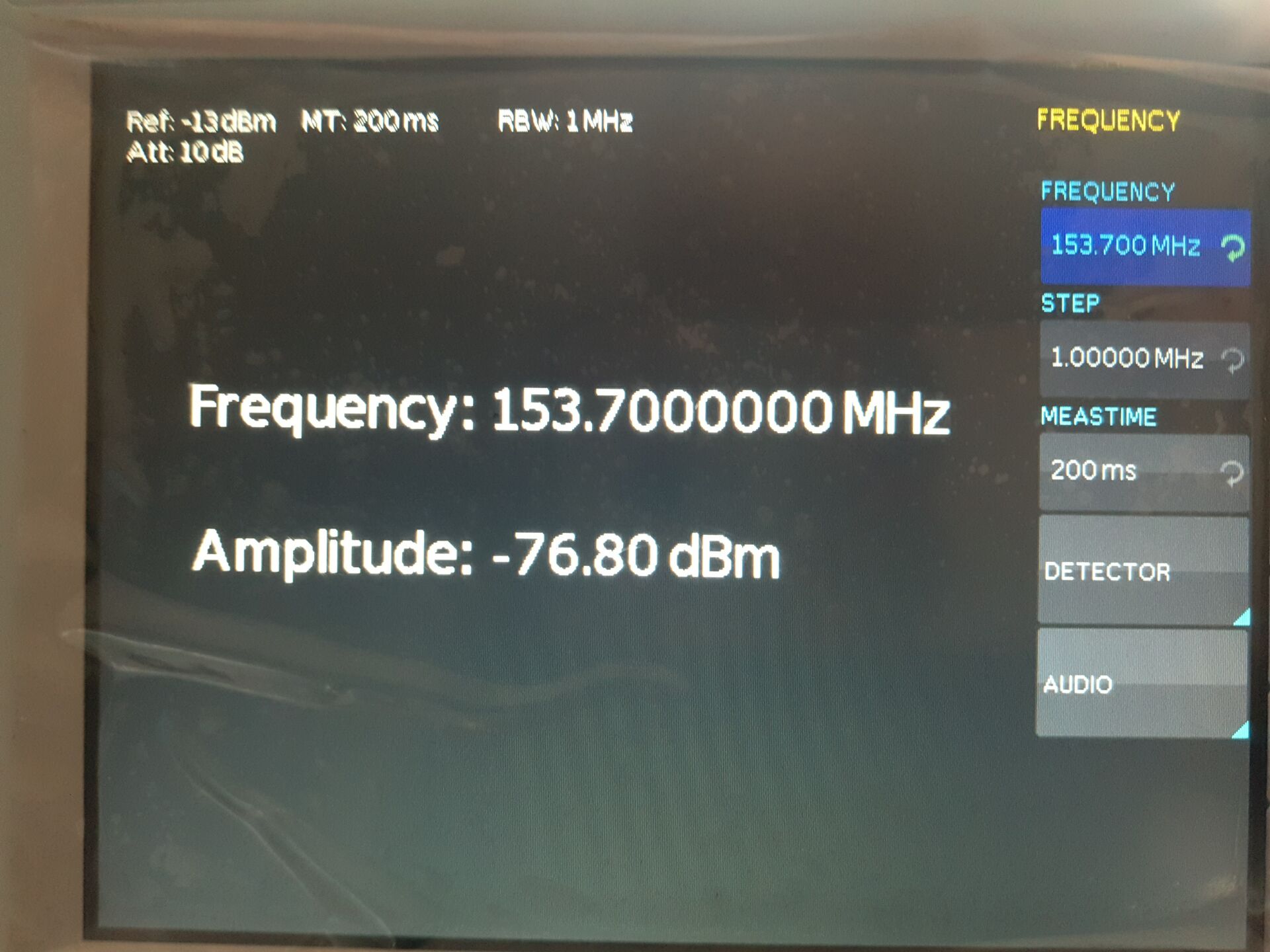 第三步:使用頻率信號接收機的頻率信號接收機功能測量對應頻點的頻率值和功率值:頻率為153.7MHz,功率值-76.8dBmW(見下圖)。