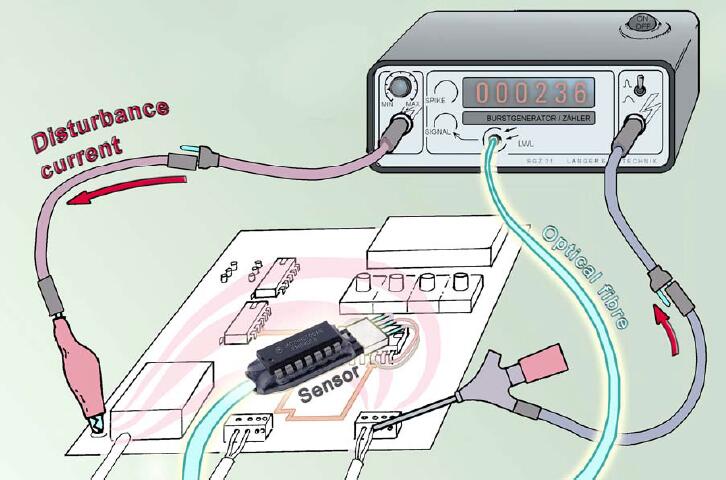 第二點是必要的。這包括更精確地定位敏感點。應當注意的是,關于從所述第一步驟中的故障模式的所有信息被認為是評估局部敏感點的基礎。已定義的干擾電流路徑將有助于定位模塊的負責故障布局結構模式。但在EN 61000-4-4合規(guī)測試中,脈沖群發(fā)生器的干擾電流指的是外殼的電位。因此在電子學中工程師不能定義給定的干擾電流路徑,這使得標準測試設置不能自動在模塊來定位故障。無電位脈沖輸出的干擾發(fā)生器是一個理想的解決方案。