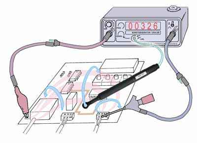 SGZ21發(fā)生器向PCB板施加干擾并用MS02瞬態(tài)磁場(chǎng)探頭測(cè)量干擾電流路徑