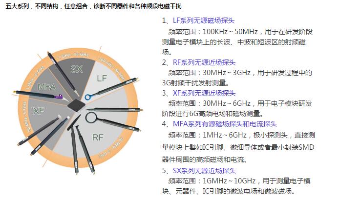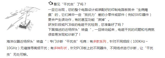 海洋儀器近場探頭”轉(zhuǎn)盤“:專門診斷“干擾蟲”毛病:有多款系列,針對不同頻段(100KHz~10GHz)無縫搜尋高頻干擾;有多種形狀,針對PCB板上的不同器件、不同結(jié)點(diǎn)進(jìn)行診斷,讓“干擾蟲”無處可躲。