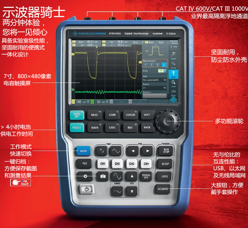 它有很多功能,工程師想象不到: 1、不用觸發,就可看見特殊的故障; 2、操作方便:通過按鍵或觸摸屏一鍵實現; 3、安全第一:業內最高安全等級,罕見四通道隔離,CAT IV高達1000Vrms; 4、五合一緊固性儀器 ? 達到實驗室性能的隔離通道數字示波器 ? 邏輯分析儀 ? 協議分析儀 ? 數據記錄器 ? 數字萬用表(僅兩通道型號RTH1002)或數字電壓表(四通道型號RTH1004) 5、無線網絡(Wifi)遙控,一觸即得 6、兩款基本型號,五個帶寬擴展(60MHz、100MHz、200MHz、350MHz、500MHz),眾多的性能擴展選件 |