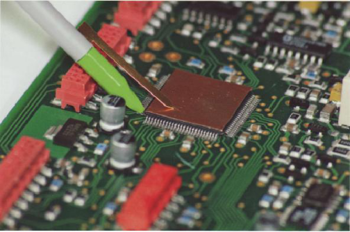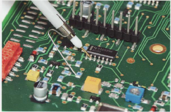 此外,HZ355無源探頭自帶進(jìn)行細(xì)間距芯片測試的配件,測試時不易造成管腳短路的危險(xiǎn)。如圖2所示:在探頭針尖上的綠色帽子具有兩個塑料側(cè),同時含羽翼式的彈簧加力的探針尖。側(cè)翼保護(hù)探頭尖端不會移開接觸,避免造成芯片管腳短路。一塊銅箔可以粘在芯片上,使探頭盡可能保持短的接地連接。在探頭上的短彈簧現(xiàn)在連接到該接地銅箔。該方式用很少的努力,就可以簡單和精確地進(jìn)行測量。