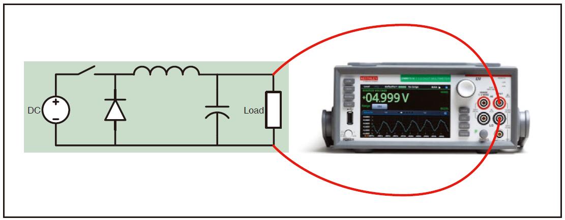 利用一對標準的測試引線,可以實現降壓轉換器與DMM7510型數采萬用表的連接,如圖1所示。當測量微弱電平信號時,建議對測試引線進行適當屏蔽。在進行測試時,利用可編程直流電源為降壓轉換器供電。降壓轉換器輸出與8W電阻負載相連。