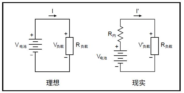 不過,實際電池具有內阻(R內),這將減少電池提供的電流數量。因此,實際電池的內阻減少了流經負載的電流,所以I1<i,因此,施加到負載的實際電壓有所下降。