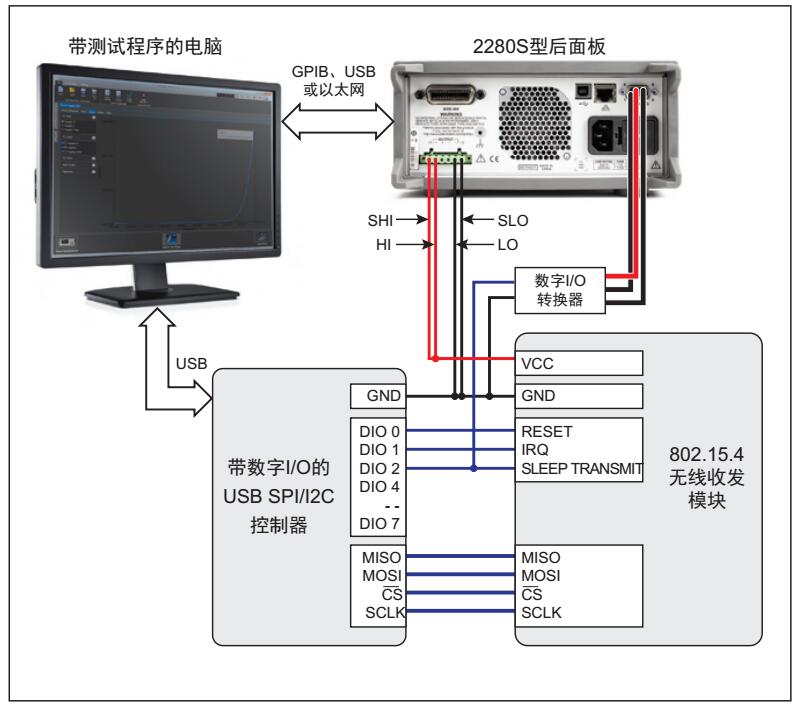 無線收發模塊通常與ZigBee網絡協議棧一起使用,來創建用于樓宇自動化和遠程傳感器檢測的產品。此收發器包括一個用于配置和操作的SPI數字接口,這使得它能夠輕松地由一個微控制器控制。然而,為了設備測試的目的,一個帶有數字I/O端口的基于USB的SPI/I2C控制器通過電腦上運行的測試代碼來配置和操作設備。這個測試代碼還配置和控制2280S系列高精度電源為設備提供功率,并且進行脈沖電流的測量。
