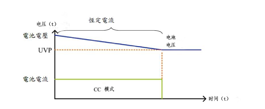 CC+UVP模式對(duì)電池放電測(cè)試相當(dāng)簡(jiǎn)便,電子負(fù)載能夠從CC定電流放電模式下自動(dòng)結(jié)束放電測(cè)試,不會(huì)讓電池過度放電而損壞,其操作模式圖如下所示:
