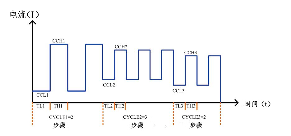 B、脈沖放電電流測(cè)試,電池放電測(cè)試使用脈沖方式,使用計(jì)數(shù)動(dòng)態(tài)模式方式測(cè)試+重復(fù)(Repeat)功能,如下圖測(cè)試時(shí)LOADON、DYNON至COUNTER=0結(jié)束,結(jié)束時(shí)LOADOFF,DYNOFF。