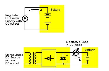 當使用電子負載時,可以設定為定電壓的負載模式,并且設定需要的端電壓。舉例來說:測試1.2V的二次電池可以設定端電壓從1.0V、1.2V、1.44V來測試電池充電器的電流調整率,然后設定為1.40V(-△V,此為表示電池已經充飽電的信號)來測試電池充電器會不會充電。