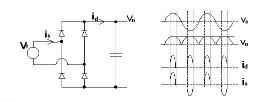 圖一:全橋式二極體整流器電路及其電壓電流波形