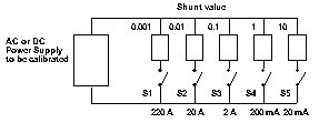 在電流源非常穩定但不甚精確的情形下,將電流源、電流表與7550串聯起來,并7550電流分流器的讀值做為一標準讀值,并以下列的校正程序進行電流表的校正。