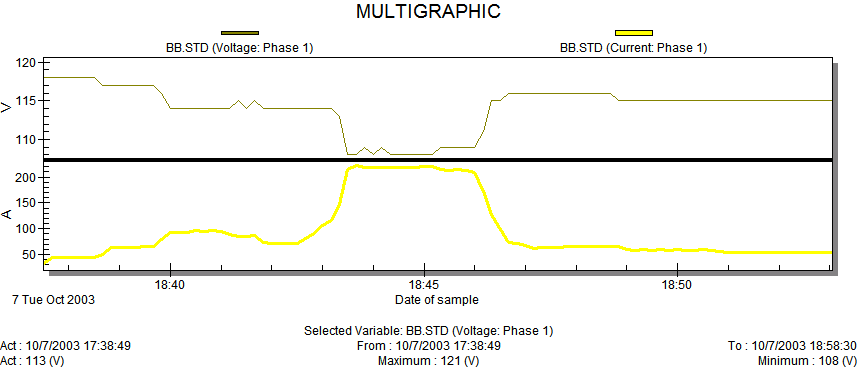電壓為什么會出現異常?很多情況下,接入建筑內的"電路"相對平坦,由于設備間相互影響,它的路面會變得崎嶇不平。例如,當您開啟垃圾粉碎機時,燈會變暗,就是由于電路中負荷短暫增加,影響了維持電燈亮度的電壓。如下圖所示,電路中電壓與電流的關系,負載電流增加,使電壓在相應時段內降低。類似這類事件可能導致計算機死機、敏感加工程序中斷、數據傳輸錯誤以及其它很多問題。
