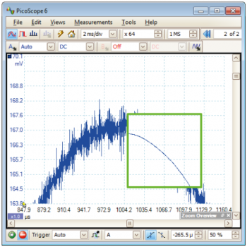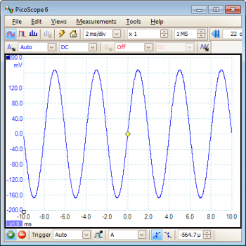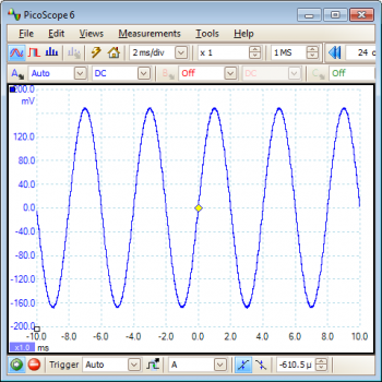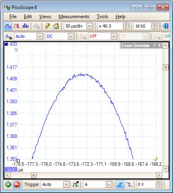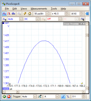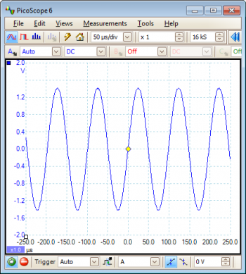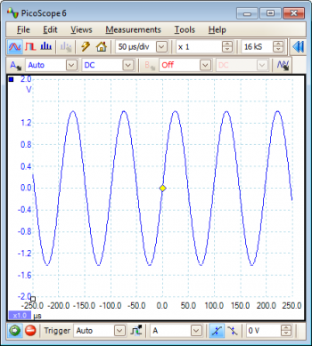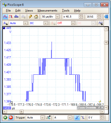 一臺8位PicoScope示波器(例如2206B型)給出了一個足夠好的視覺來顯示波形,如圖1所示。該波的頻率和振幅,可以合理的精度測量。但是,放大64倍后(圖2)顯示了8位分辨率的限制。