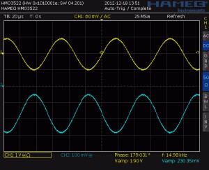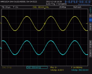 該模擬輸出信號的電平基于ADC模數轉換的200mV/DIV(100mV/DIV在50Ω)。下面的截圖為2V幅度和15kHz的正弦波,左邊為HMO3522示波器、右邊為HMO1024示波器:CH1(黃色)為原始信號、CH2(藍色)為Y-OUT輸出信號。