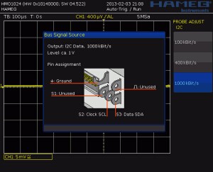 圖1 在HMO系列示波器上總線信號源輸出管腳  圖2 在HMO系列示波器上總線信號源屏幕