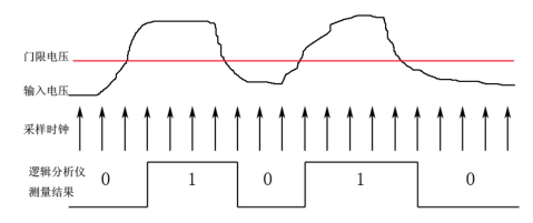邏輯分析儀的測量原理是采用一定的頻率,對輸入信號與設定的門限電壓進行比較,當輸入電平大于門檻電壓時為邏輯1,當輸入電平低于門檻電壓時為邏輯0。圖1.3為示波器與邏輯分析儀的測量結果比較。
