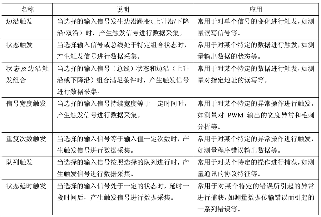 表1.2 邏輯分析儀常用觸發方式