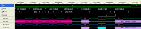 圖1.9中CS、SCK、MOSI、MISO為原通訊數據,DataIn、DataOut為進行SPI總線分析的結果,InCmd、OutCmd為進行協議分析的結果。
