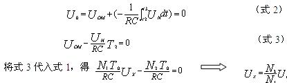 (2)采樣階段(t1——t2):設被測電壓Ux為負電壓。t=t1時,S4斷開S1閉合,積分器對Ux積分,U0從零開始線性上升,同時閘門被打開,計數器的計數容量為N1,當計數器的值達到N1+1時,計此時刻為t2,計數器溢出,產生一個進位脈沖給邏輯控制電路,控制開關S1斷開。t=t2時: