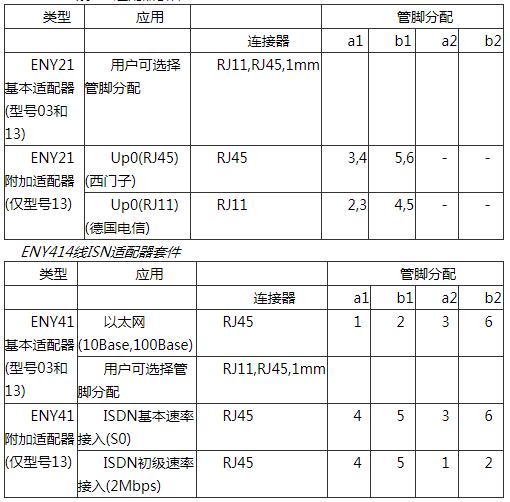 ENY21 2線ISN提供一個基本的適配器套件(下表),包括用戶可選的接線連接器(1mm香蕉插頭),ENY21型號13還包括2個附加的適配器套件,包括許多電話標準(德國電信,西門子)使用的RJ11和RJ45連接器。