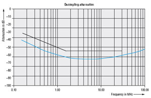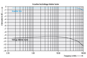 對稱電路典型插入損耗—100Ω線性阻抗測量(上面曲線) —決定有用的信號耦合網絡傳輸帶寬;典型分壓系數(下面曲線)疊加到被測電壓(頻率范圍150kHz~30MHz),與干擾門限對比。 |
