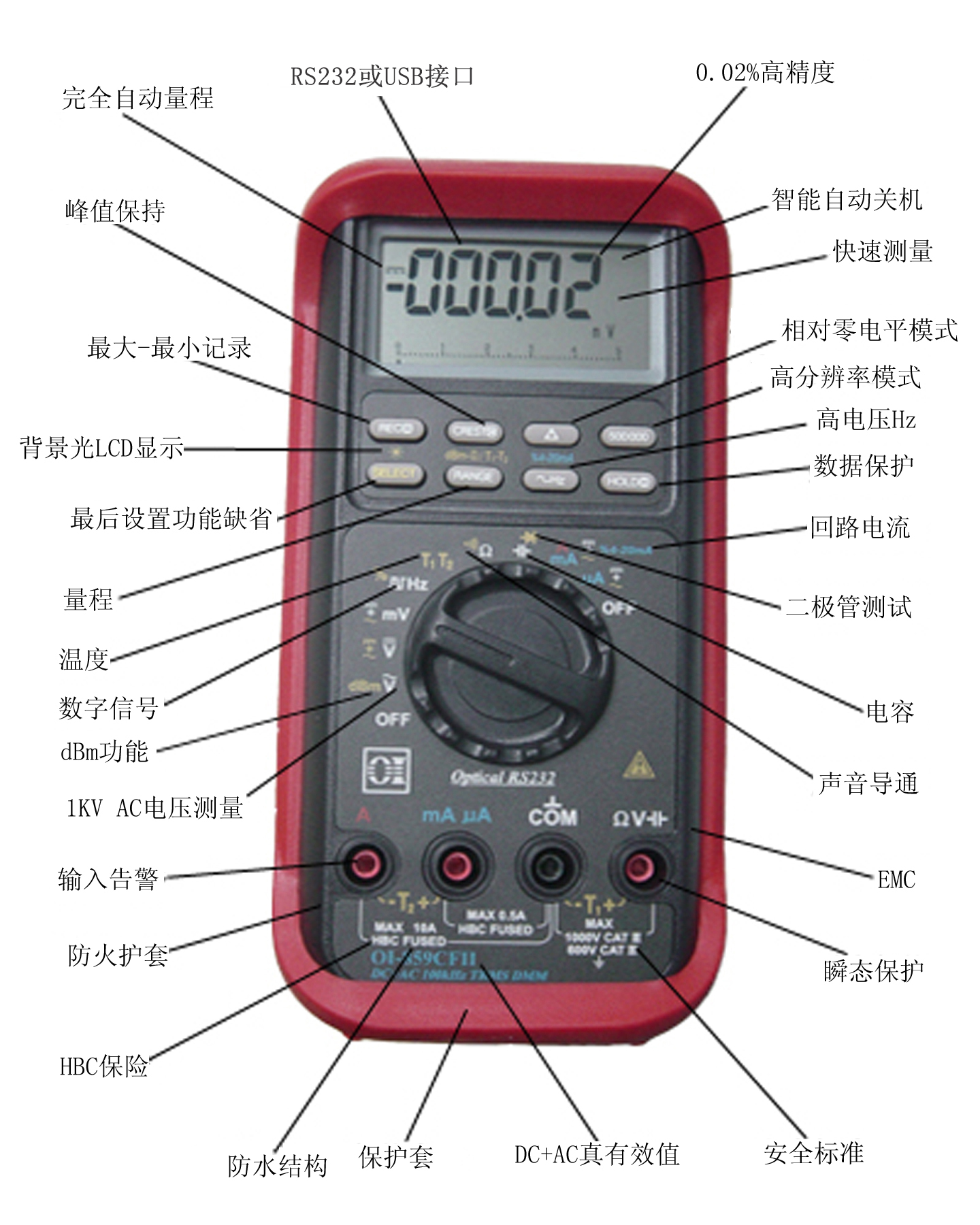2) 直流電壓顯示位數高達5 4/5位,頻率顯示時更高達6位;直流精度為±0.02%