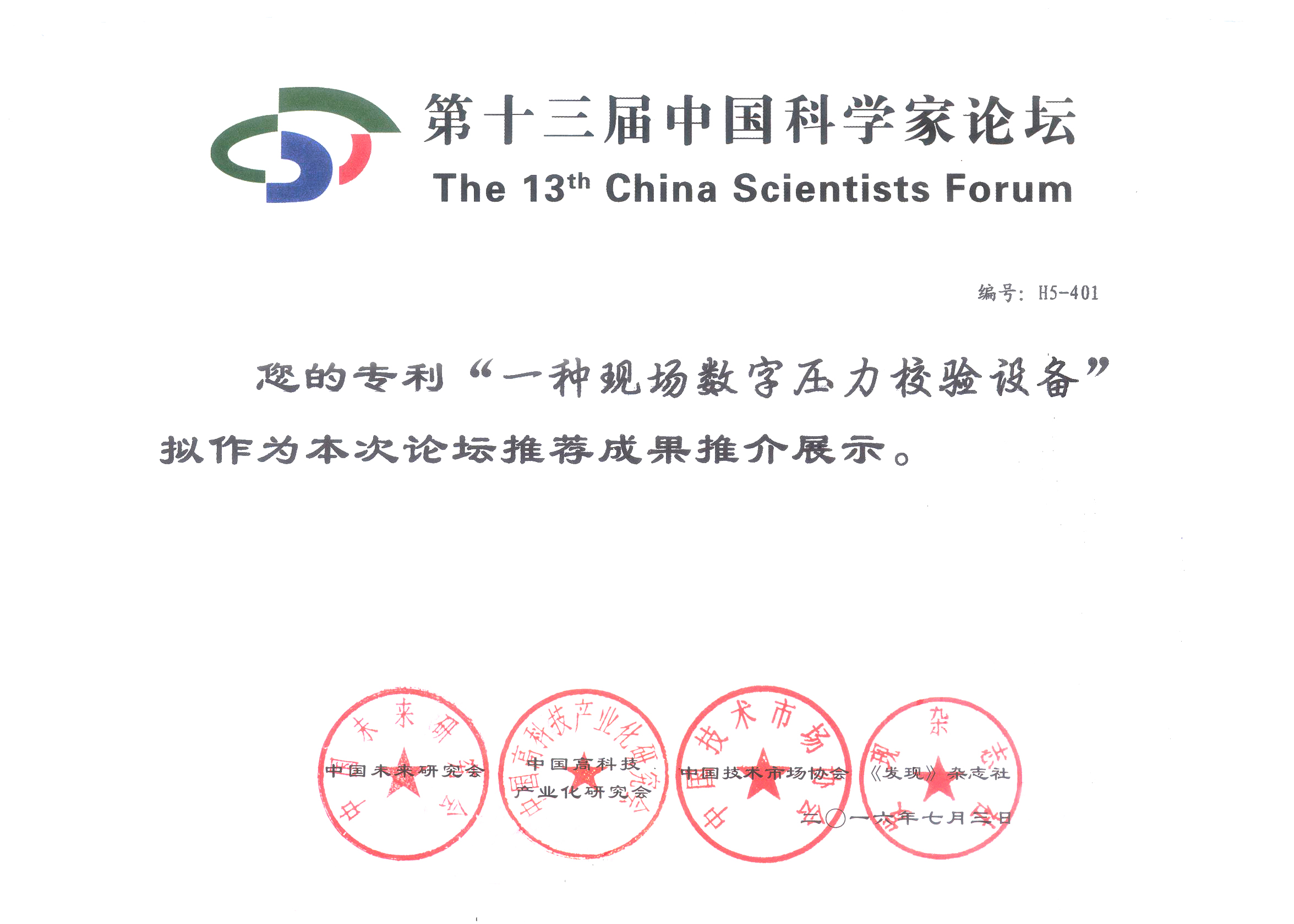 海洋儀器的專利(ZL.201520149261.X)產(chǎn)品“一種現(xiàn)場(chǎng)數(shù)字壓力校驗(yàn)設(shè)備”,被中國(guó)未來(lái)研究會(huì)、中國(guó)高科技產(chǎn)業(yè)化研究會(huì)、中國(guó)技術(shù)市場(chǎng)協(xié)會(huì)、發(fā)現(xiàn)雜志社等單位作為專利成果推薦參加第十三次中國(guó)科學(xué)家論壇。