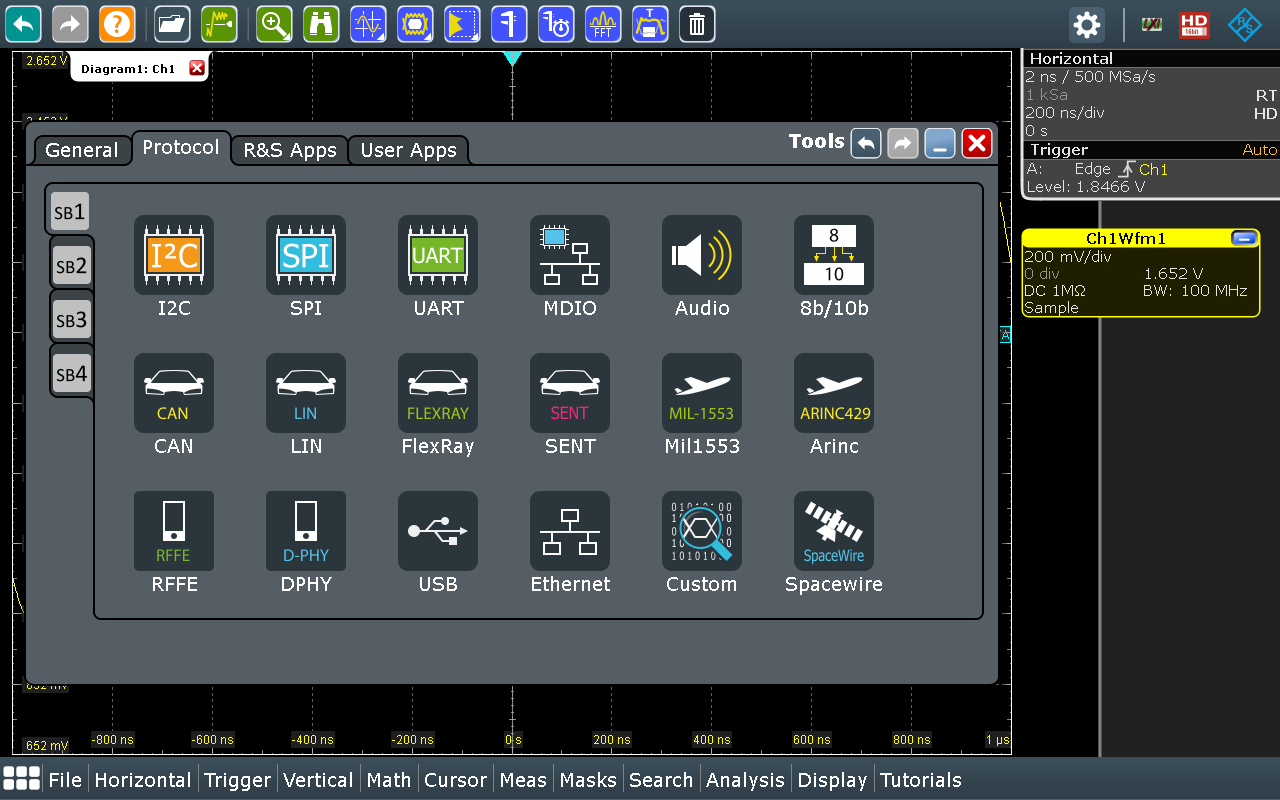 經(jīng)過優(yōu)化的用戶接口界面使RTO2000系列高性能數(shù)字示波器更加易于操作。明亮的12.1英寸電容觸摸屏支持多點(diǎn)手勢(shì)控制和顏色編碼控制,用戶可以快速簡(jiǎn)便地設(shè)置儀器進(jìn)行各種測(cè)量任務(wù)。SmartGrid智能網(wǎng)格可以實(shí)現(xiàn)波形顯示的用戶定制;Toolbar快捷菜單方便用戶快速進(jìn)入所需的重要工具;同時(shí)支持測(cè)量結(jié)果和儀器設(shè)置的一鍵存檔。應(yīng)用控制臺(tái)提供了各種分析應(yīng)用工具的直接進(jìn)入,包括各種觸發(fā)解碼、一致性和信號(hào)完整性分析、I/Q分析、甚至包括用戶自定義開發(fā)工具。