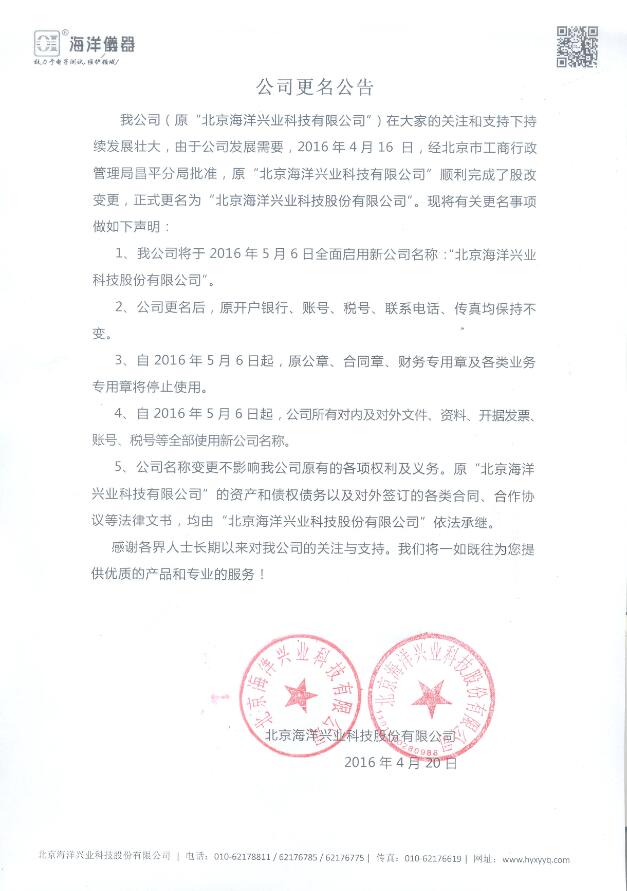 1、我公司將于2016年5月6日全面啟用新公司名稱:“北京海洋興業科技股份有限公司”。